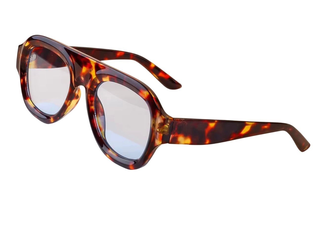 • Armação em acetato translúcido em tom âmbar castanho, com acabamento brilhante.