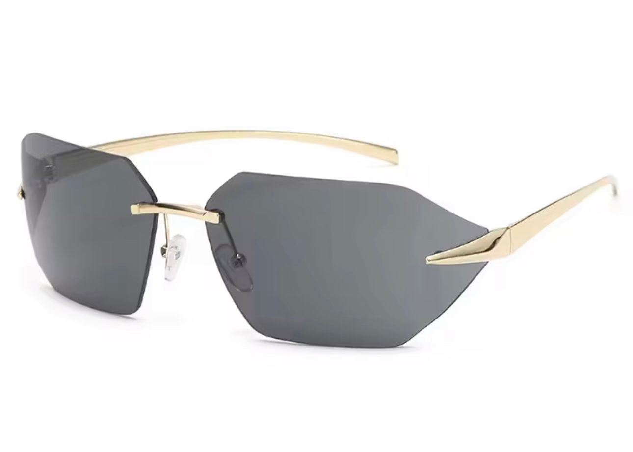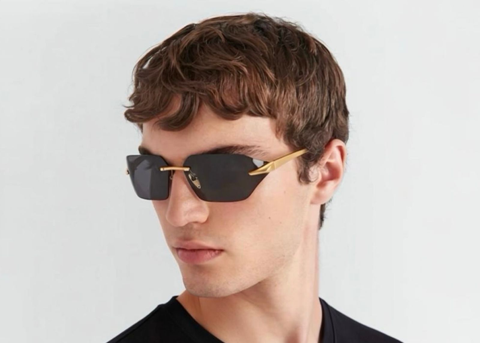 Os óculos Aresta combinam design futurista e minimalismo sofisticado com estrutura rimless dourada.